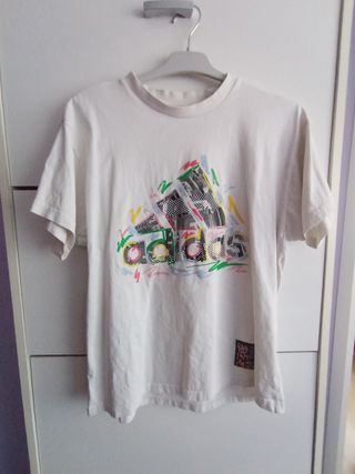 Preciosa camiseta de Adidas en color blanco, talla XS. Es una prenda única y llamativa. - Diseño vintage con logo Adidas. - Manga corta. - Cuello redondo.