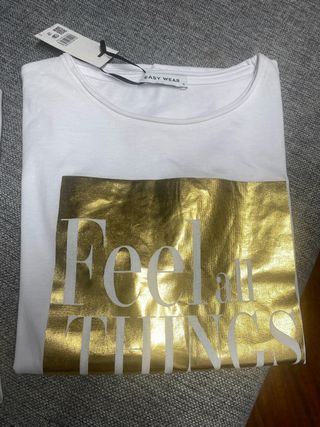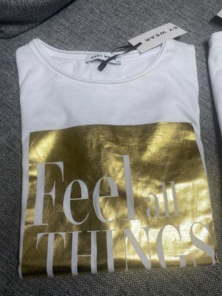 Camisetas de manga corta con un llamativo estampado metálico dorado. - Diseño frontal con texto Feel all THINGS. - Cuello redondo. El precio es por las dos. Por separado 4€ cada una.