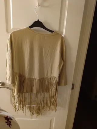 Elegante blusa de Zara con un diseño tejido y detalles de flecos en el bajo. Perfecta para un look sofisticado. - Tejido texturizado. - Diseño sin mangas. - Cierre de cremallera en la espalda. - Flecos decorativos en el dobladillo.