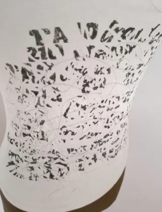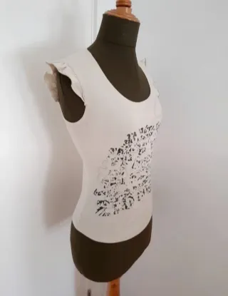 Camiseta Beige/ Crema con Estampado en color verde caqui. Lleva gomas delanteras insertadas entre el Estampado. Pone talla M pero es muy ajustada Seria más una talla S O incluso una XS si te gusta un poco más suelta. Foto hecha sobre maniquí talla S/M. Medidas Maniquí Contorno pecho 85cm Contorno cintura 61cm Contorno cadera 90cm En el maniquí va muy ajustada. Comprara tus medidas El algodón es fuerte y tupido. Consistente y con cuerpo. Tiene decoración en los hombros ( volantes ) La he usado Tiene una mancha pequeñita en la parte de atrás y en una de las axilas Se ve en las fotos de detalle Por lo demás está muy bien