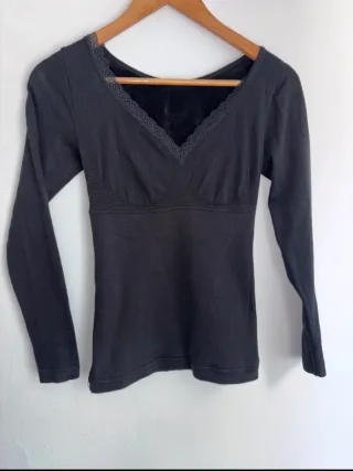 Camiseta de manga larga térmica. Talla XS. Escote muy favorecedor. Encaje en el pecho. Ideal para chicas frioleras 😉 Medidas: - Largo total: 55.5 cm - De axila a axila: 32 cm - Debajo del pecho: 30 cm - Ancho abajo del todo: 34 cm