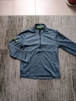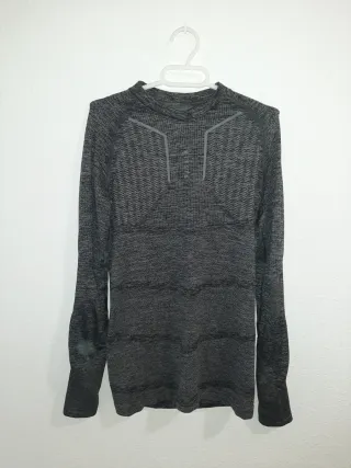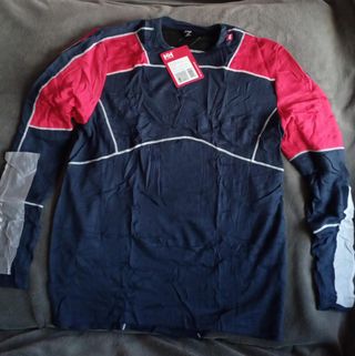 Camiseta térmica de manga larga con tejido elástico. Ideal para mantener la temperatura corporal en actividades al aire libre. Se puede usar como primera capa, transpirable Totalmente nueva a estrenar Dimensiones Largo 62 cm Hombros 36 cm Axilas 43 cm Manga 63 cm - Cuello redondo. - Puños ajustados. - Logo discreto en la parte inferior.