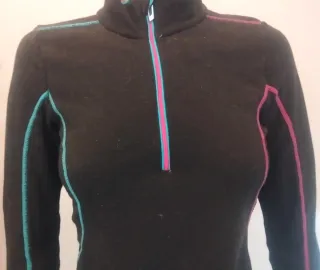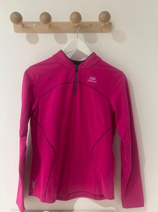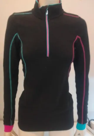Camiseta térmica de manga larga con cremallera. - Cuello alto. - Costuras de contraste en rosa y turquesa. - Puños y cuello con ribete de contraste. - Talla XS. - Marca Decathlon. - 80% poliéster / 20% lana. - Poco uso, como nueva.