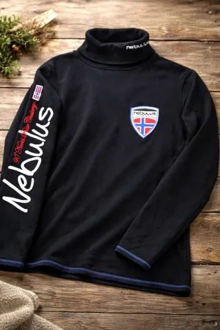 Camiseta térmica de manga larga con cuello alto. - Diseño con logo de Nebulus en el pecho. - Detalle de texto y bandera en la manga. - Costuras en contraste en puños y bajo.