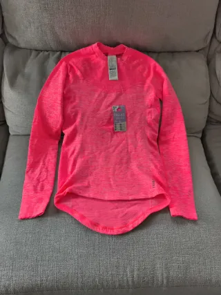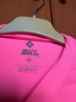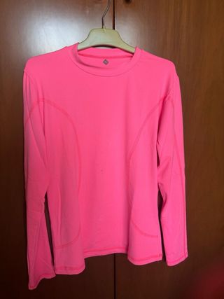 Camiseta térmica de manga larga en color rosa. Con alguna marca en la parte delantera como se aprecia en las fotos
