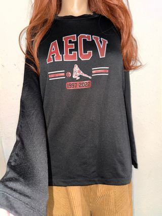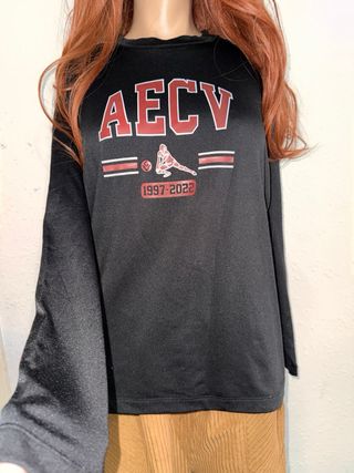 Camiseta deportiva de manga larga con diseño de voleibol. - Estampado frontal AECV con figura de jugador y 1997-2022. - Cuello redondo. - Mangas largas. Tiene lineas reflectantes