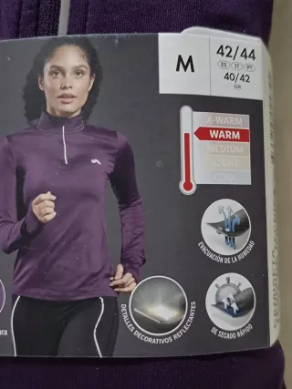 Camiseta térmica técnica de manga larga para mujer. Talla M. -Es cómoda y cálida gracias al interior afelpado. - Cuello alzado con cremallera. - Puños con abertura para el pulgar y el smartwatch. - Detalles reflectantes decorativos. - Se seca rápidamente y regula la humedad.
