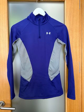 Camiseta deportiva de manga larga Under Armour. Cuello alto con cierre de cremallera, dos bolsillos laterales y zonas laterales más finas para permitir transpiración durante el ejercicio. Es muy cómoda y queda entallada. El color es morado oscuro.