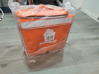 Mochila térmica de la marca Just Eat, ideal para repartos. - Color naranja brillante. - Diseño con asas y cierre de cremallera. - Detalles reflectantes para mayor visibilidad. Incluye camiseta talla L