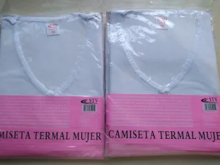 2 camisetas térmicas para mujer de manga corta. - Cuello pico. - Interior afelpado para mayor calidez. - Tejido 100% algodón. - Color blanco. - Talla L/ 56
