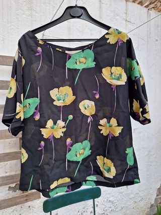 Blusa de manga tres cuartos con un diseño floral por delante y por detrás es lisa. Tejido ligero y fluido: 96% viscosa 4% elastano. Las medidas las puede ver en las fotos.