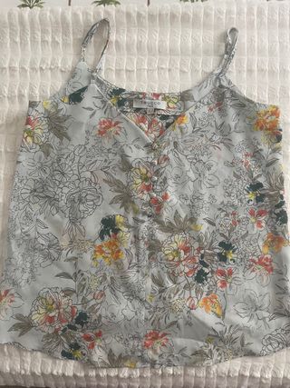 Precioso top con estampado floral en tonos azules y marrones. Es ligero y tiene un corte favorecedor. - Escote en V. - Cintura elástica. - Tejido vaporoso.