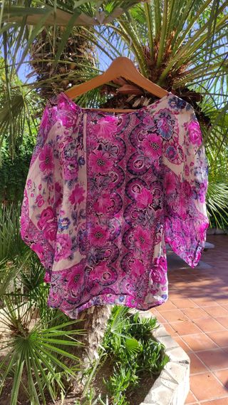 Blusa rosa de marca Trucco, talla 42, tiene dos tiras en la parte del cuello a la derecha que bajan hasta la mitad más o menos y si tiras de ellas hace un precioso efecto fruncido, está como nueva, también tiene un largo cordón a modo de cinturón que queda muy bonito. No dudes en preguntarme si tienes alguna cuestión. Más cositas chulas en mi perfil!