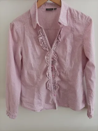Camisa de rayas rosas y blancas con detalles de volantes en la parte delantera. Cuello camisero y cierre de botones. - Diseño de rayas verticales. - Volantes decorativos en el frente. - Puños con detalle de volantes.