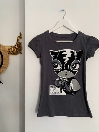 Camiseta vintage de Bershka con un diseño de gato. - Estampado frontal de gato con antifaz y lazo. - Mensaje Maybe he is looking... en la parte inferior. - Mangas cortas abullonadas. Nueva a estrenar aunque corté las etiquetas porque eran enormes