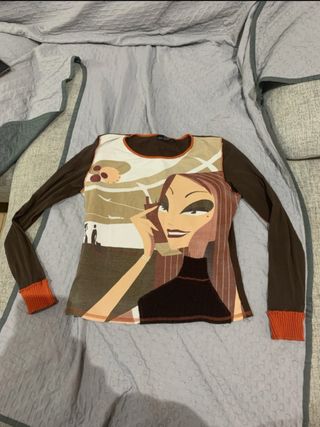 Camiseta vintage con estampado de Garriris de Mariscal. Pieza vintage años 80’ comprada en la tienda de Mariscal Trafico de Moda (Valencia). Es pieza de coleccionista, pero se puede usar como camiseta. - Estampado integral de Garriris. - Manga larga. - Cuello redondo. -Fondo beige pero no uniforme (siempre fue un fondo como a “aguas”)