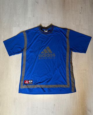 Camiseta deportiva vintage de Adidas, perfecta para los amantes del baloncesto. Su diseño clásico y cómodo la hace ideal para el día a día. - Diseño con logo grande de Adidas Basketball en el pecho. - Detalles de líneas grises en los laterales y mangas. - Cuello redondo acanalado.