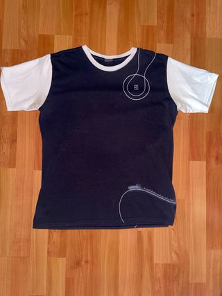 Camiseta de manga corta con cuello tipo polo. - Diseño bicolor, azul claro y azul marino. - Logo de la marca bordado en el pecho. Hecha en España, vintage. Talla 44 pequeña.