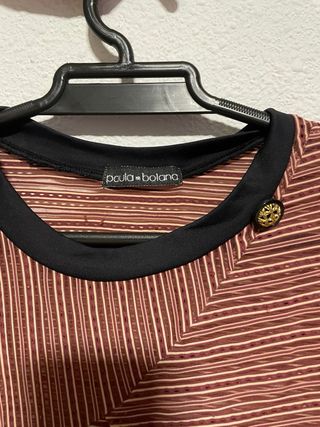 Camiseta top vintage de cuello ancho estilo barco y manga 3/4 muy original. Elástico. Perfecto estado. Talla M de mujer. Se vende porque no se utiliza. Medidas aproximadas: de axila a axila 44 cm y de largo 47 cm. Buen estado. Poliamida.