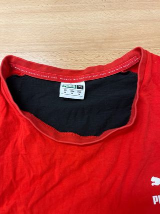 Camiseta deportiva con un diseño llamativo en bloques de color. - Diseño en V con rojo y negro. - Detalles blancos en las mangas. - Logo de Puma en el pecho.