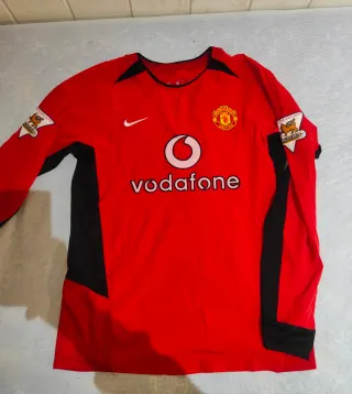 Camiseta de fútbol vintage del Manchester United, temporada 2002-2003, con el dorsal de Cristiano Ronaldo. - Manga larga. - Parche de la Premier League de campeones - Logo de Vodafone. - Escudo del club.
