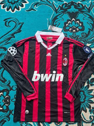 Camiseta de fútbol vintage del AC Milan, usada por Ronaldinho. - Diseño a rayas rojas y negras. - Logo de Adidas bordado. - Escudo del AC Milan. - Parche de la Champions League. - Sponsor 'bwin'.