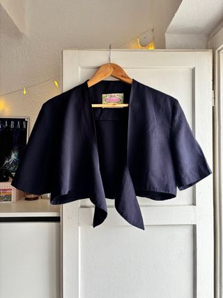Blusa camisera vintage marca Pendiente. Tipo torera/bolero. Se cierra en el frente con un nudo. Se puede usar sola (se vería la ropa interior) o como sobre camisa. Color azul marino. Talla S (aprox.) Recomiendo fijarse en las medidas. Medidas: - Hombros: 45cm - Largo: 36cm - Largo manga: 27cm #Blusa #Camisa #Torera #Vintage #AzulMarino #MangaCorta #CamisaCorta #CamisaVintage #BlusaVintage