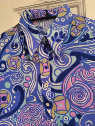 Camisa vintage con un llamativo estampado de círculos en tonos azules y morados. Su diseño la hace única. - Estampado de círculos. - Cuello camisero. - Cierre de botones. - Bolsillos en el pecho.