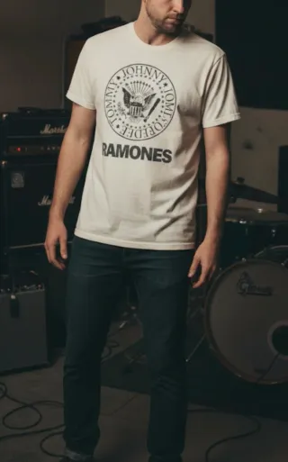 camiseta de los Ramones en color blanco roto / crema. Es el diseño icónico con el logo del águila y los nombres de los integrantes originales (Johnny, Joey, Dee Dee y Tommy). Estado: Muy bueno, con ese toque "vintage" que tanto gusta. Color: Blanco crema (no es blanco nuclear), lo que le da un aspecto más retro. Estilo: Perfecto para looks rockeros, grunge o casuales. Combina genial con vaqueros oscuros o chaquetas de cuero. Detalles: Cuello redondo y corte estándar muy cómodo.