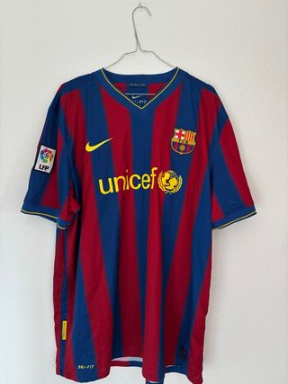 Camiseta vintage del FC Barcelona, un clásico para los aficionados. - Diseño a rayas rojas y azules. - Logo de Nike y escudo del club. - Inscripción unicef en el frontal. - Parche LFP en la manga. -Hago envíos ‼️No doy información por WhatsApp ‼️