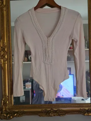 Body de manga larga con un bonitos detalles de pedrería y botones en el escote. Escote en pico con adornos. Manga larga. Diseño ajustado. Tejido se altísima calidad Precioso color rosa pastel