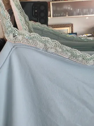 Top de tirantes Vintage de la marca Sandro (modelo registrado), sin usar. Un diseño delicado y femenino. Tirantes finos con detalle de encaje y pedrería. Escote adornado con el mismo encaje. Color azul claro.