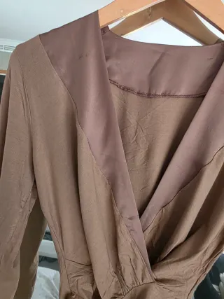 "Bodysuit escote cruzado manga larga marrón". El estilo presenta un diseño de envoltura (wrap-over) con escote pronunciado en forma de V y una sección de satén o tela brillante en el cuello y el escote, que contrasta ligeramente con el resto del tejido,más mate. Christies, reconocida marca de lencería de lujo, conocida por sus diseños de encaje y calidad Sus piezas vintage de los años 90 y colecciones actuales son valoradas por su diseño detallado y materiales de lujo