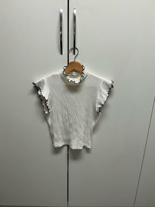 Camiseta de manga corta con cuello alto y detalle de volantes. - Tejido acanalado. - Volantes con borde negro en cuello y mangas.