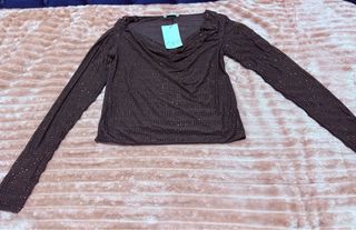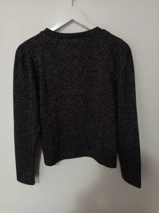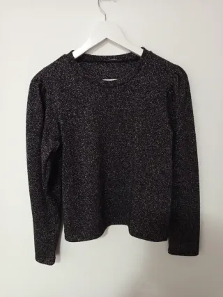 Camiseta de Zara con un tejido brillante que combina negro y dorado. Ideal para añadir un toque festivo a tu look. - Manga larga. - Cuello redondo. - Tejido con hilo metalizado.