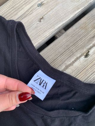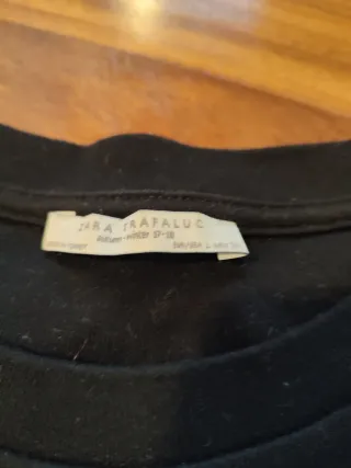 Camiseta negra de Zara con textura de canalé o gofre lo que le da una sutil elasticidad. Acabado ondulado (ribete lettuce) en los bordes de las mangas y el bajo. Talla M. De hombro a hombro mide 31 cm. De sisa a sisa mide 35 cm y de largo mide 47 cm. Está en perfecto estado. Te invito a visitar mi perfil.