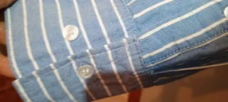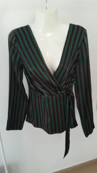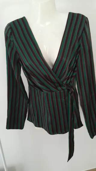 Elegante camisa de Zara con un diseño de rayas verticales en tonos verde y marrón. Ideal para ocasiones especiales. - Corte cruzado con lazada. - Manga larga. - Escote pronunciado. Camisa muy elegante va cruzada ideal para llevar con pantalón azul muy oscuro. Medidas. Hombros 38 cm. Axila 44 x. Mangas 60 cm. Largo 60 cm. Impecable como nueva.