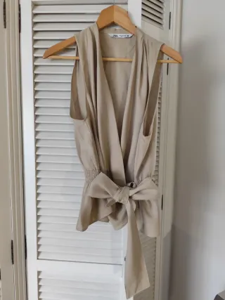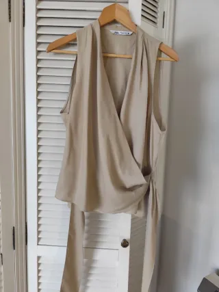Camiseta de la marca Zara, nueva y sin usar. Un diseño elegante con detalles que marcan la diferencia. - Cuatro botones dorados en la parte frontal. - Tirantes anchos. - Corte acampanado en la parte inferior.