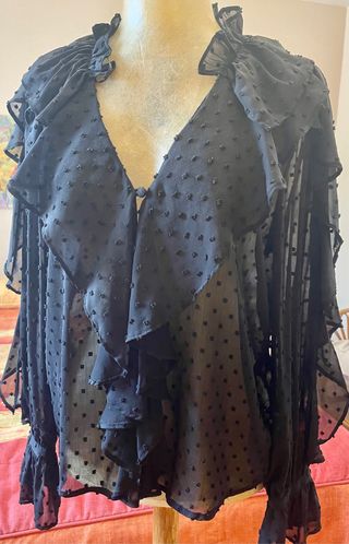 Elegante blusa de Zara con un diseño de estrellas o puntos brillantes. Es semitransparente pero no mucho - Manga larga. - Escote pronunciado en la espalda acabado en U - Tejido ligero y fluido. Me costó 50€