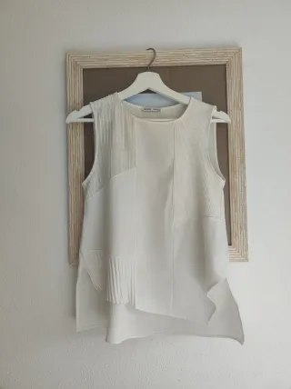Elegante blusa sin mangas en color blanco. Presenta un diseño asimétrico con detalles plisados y diferentes texturas Cuello redondo..en perfecto estado.