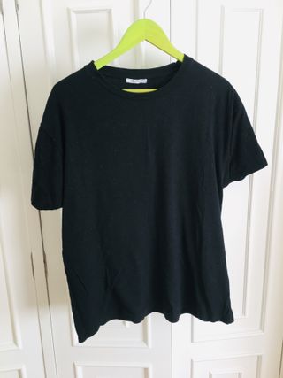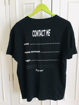 Camiseta básica negra de manga corta, talla L de Zara. Con letras en blanco en la espalda. Camiseta Contact me. Tiene muy poco uso, está como nueva. MEDIDAS: sisa 63cm, largo desde sisa 43cm