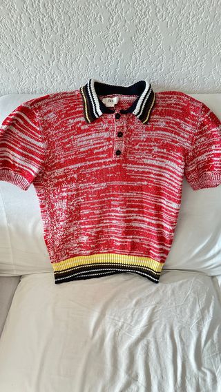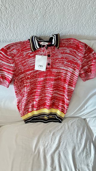 Camisa polo de Zara con un diseño vibrante y llamativo. - Tejido de punto con estampado de rayas irregulares. - Cuello tipo polo con botones. - Puños y bajo con detalles de rayas. - Manga corta.
