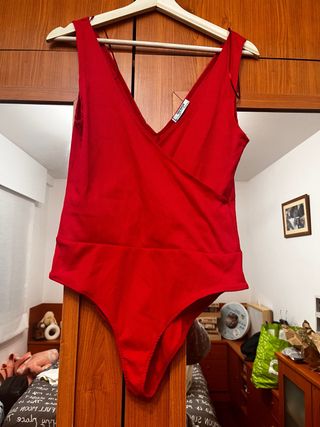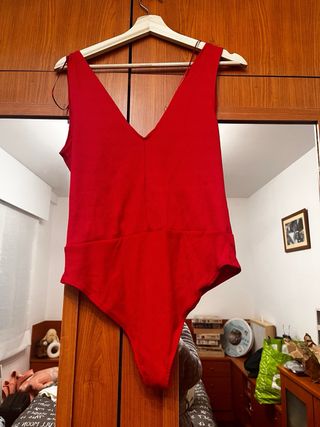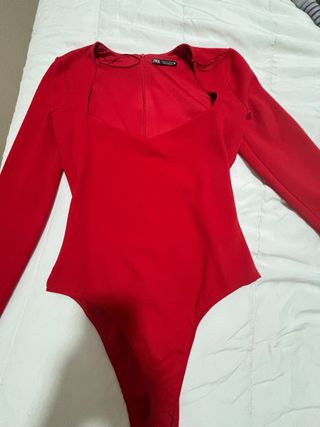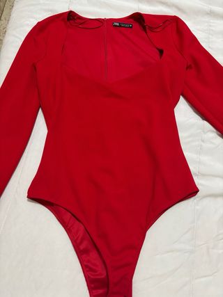 Body elegante de Zara en color rojo, con un diseño de corazón en el escote y mangas largas. - Escote en forma de corazón. - Mangas largas. - Cierre de cremallera en la espalda.