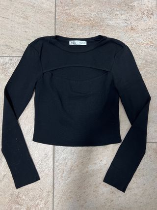 Top corto de manga larga con un diseño moderno y atrevido. - Corte crop. - Manga larga. - Escote redondo con abertura. - Tejido texturizado.