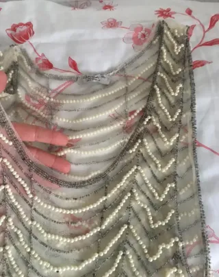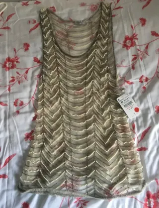 Elegante top de Zara con un diseño intrincado. - Adornado con perlas y detalles plateados. - Patrón en zigzag y ondas. - Tejido ligero y transparente.