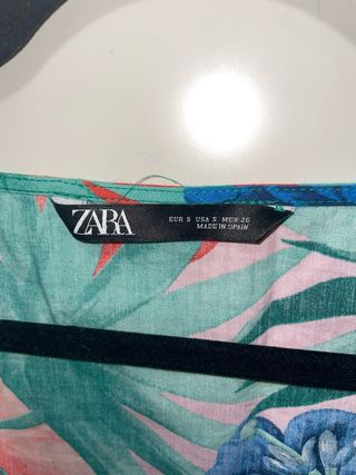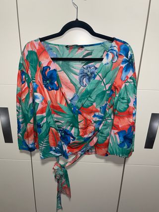 Top de Zara con un vibrante estampado tropical. Diseño cruzado con nudo. - Manga larga. - Escote en V. - Detalle de nudo en la parte delantera. - Talla S pero da para más
