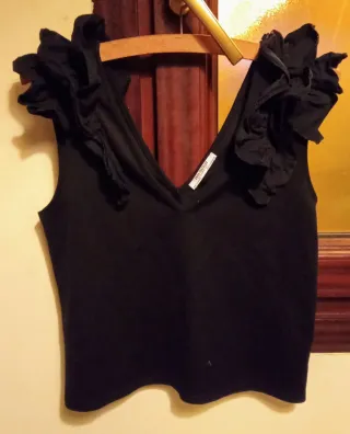 Top negro con un diseño original y femenino. - Escote en V. - Detalle de volantes en los hombros. - Sin mangas.