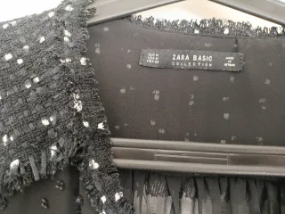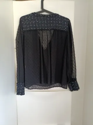 Elegante blusa de Zara con un diseño delicado y detalles que la hacen única. - Tejido semitransparente con pequeños topos. - Mangas largas. - Cuello con detalle de tweed deshilachado - Puños detalle de tweed deshilachado