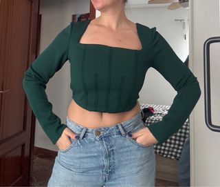 Top de Zara con un diseño moderno y favorecedor. - Color verde oscuro. - Escote cuadrado. - Mangas largas. - Corte ajustado. Espalda descubierta