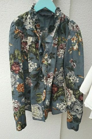 Blusa de Zara con un estampado floral vibrante y detalles de volantes. - Diseño con cuello fruncido. - Cierre de botones. - Mangas largas.
